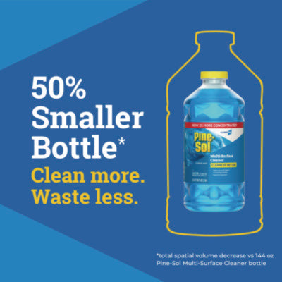 This 2X concentrated formula makes 2X more cleaning solution than previous Pine-Sol® scented formula.Scented formula now cleans 5X better when used full strength versus the previous Pine-Sol scented formula on soap scum.This multipurpose cleaner cleans without leaving a sticky residue and is safe for use on stainless steel, vinyl, laminate, linoleum, chrome and more.Cuts through tough grease, grime, dirt and soap scum while leaving behind a clean scent for your toughest messes.One bottle reduces plastic waste by 30% compared to previous Pine-Sol 144 ounce bottle.Item Number: CLO60609EAGTIN: 00044600606095Shipping Dimensions | Width: 4.7 in. Height: 4.7 in. Length: 10.625 in. Weight: 5.5 lbs.